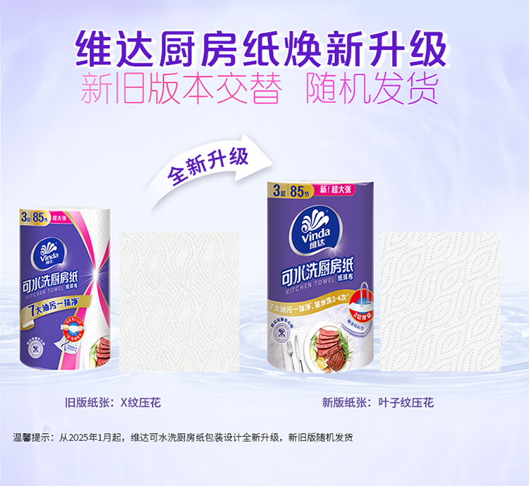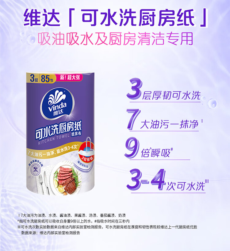 首页> 美妆个护> 清洁洗护> 清洁用品> 维达可水洗厨房卷纸3层85节*6卷