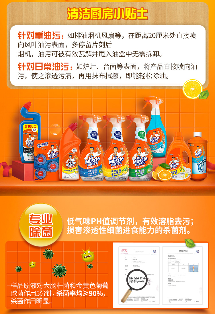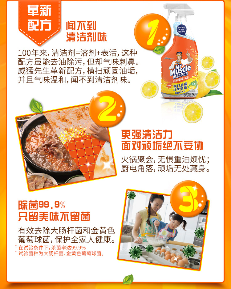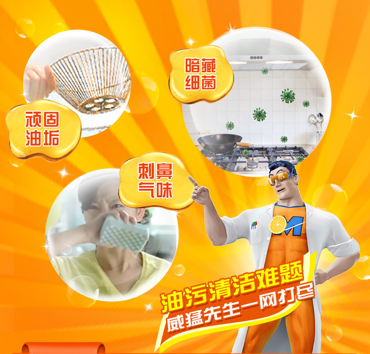 威猛先生重油污泡泡净(小青柠香),含 G14 净油因子 + Micellar 溶油科技,快速瓦解顽固油渍。绵密泡泡挂壁持久,双喷头适配多场景。99.9% 除菌率,pH 温和不伤手不刺鼻。小青柠清香净味,一喷一擦无残留,厨房清洁省时省力