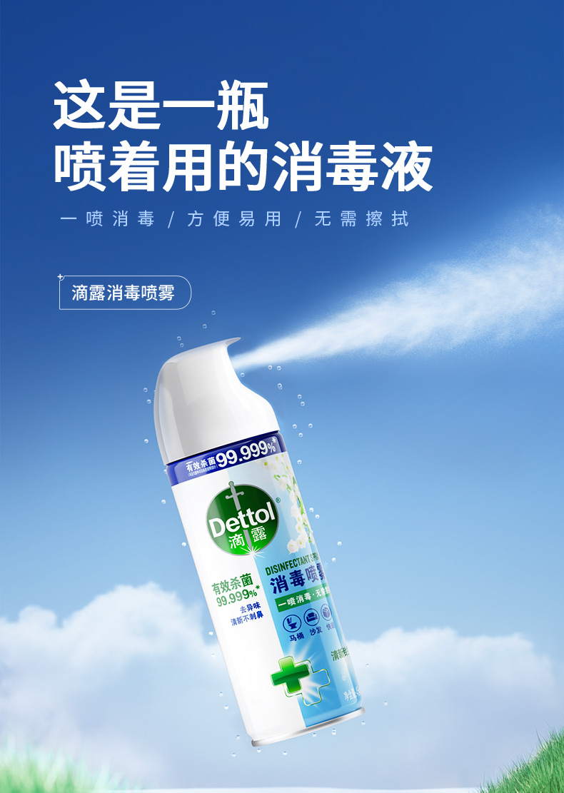 滴露消毒喷雾(清新铃兰 454ml),30 秒速杀 99.999% 细菌真菌、99.99% 灭活常见病毒,72 小时长效抑味。75% 酒精配方吸入无毒,清新铃兰香淡雅祛异味,喷雾细腻速干免擦免稀释。硬表面、织物、宠物区等多场景通用,大容量耐用,日常消毒便捷安心