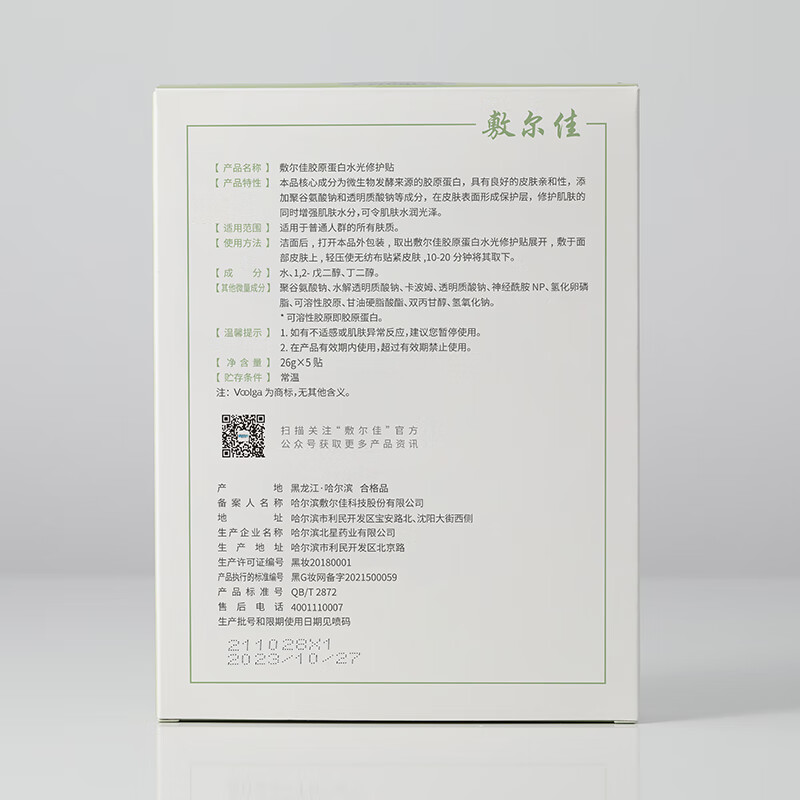 敷尔佳胶原蛋白水光修护贴(绿膜)5贴/盒