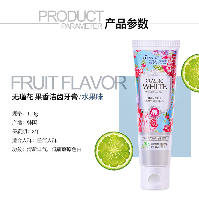 首页> 美妆个护> 口腔护理> 牙膏/牙粉> 無瑾花 果香洁齿牙膏(水果味)110g